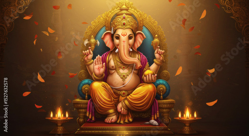 Ganesha Idol Surrounded by Floating Leaves and Diyas