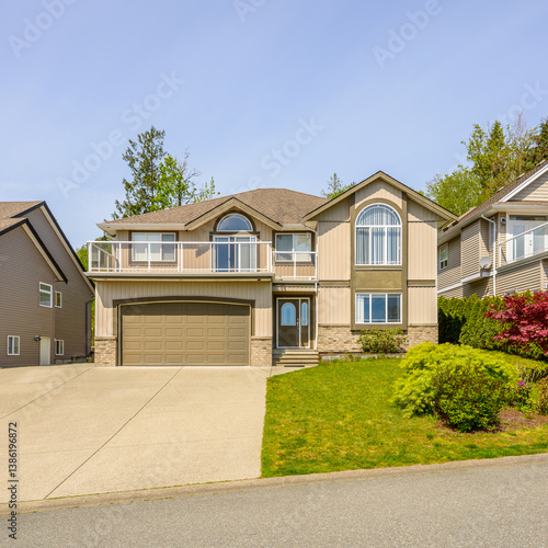 Garage door in luxury house with trees and nice landscape in Summer in Vancouver, Canada, North America. Day time on June 2024.