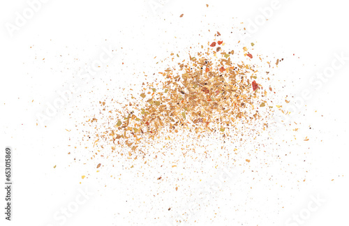 Garam masala, minced spice blend, mix black pepper, coriander, cumin, garlic granules, allspice, sea salt, ground chili peppers, cinnamon, cloves grain, chopped ginger, bay leaves isolated on white