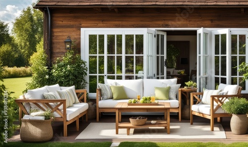 Garden lounge, outdoor furniture and countryside house patio decor with sofa and table, country cottage style landscape design,