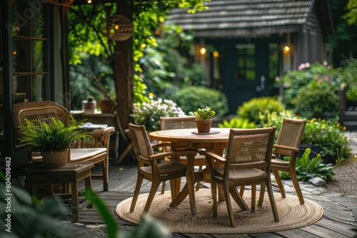 Garden outdoor dining area with wooden chairs and table professional photography