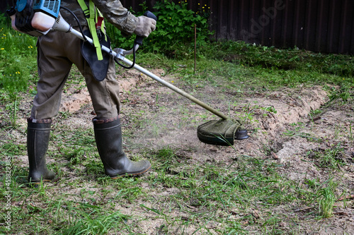 Gardener mows grass with lawn mower. Trimmer is in hands of man. Concept of garden work. Lawn care