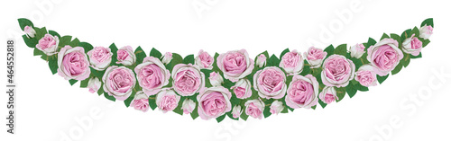 garland of pink roses. Pink rose flowers, green leaves garland, white background. Wedding invitation banner. Vector illustration. Floral arrangement. Design template greeting card