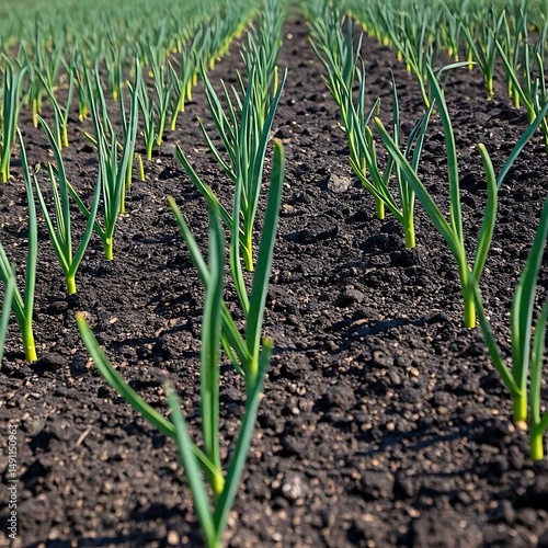 Garlic shoots sprouting evenly in rows across dark compost-enriched land.