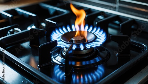 Gas Burner in a Kitchen with Blue and Orange Flames
