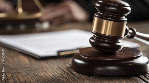 Gavel on Wooden Desk with Legal Documents and Scales