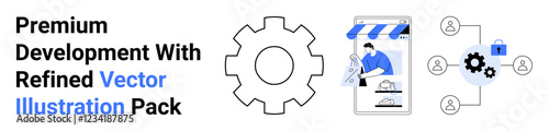 Gear icon, person managing store app interface, connected users with lock. Ideal for technology, teamwork, security, e-commerce, app management, web development flat landing page banner