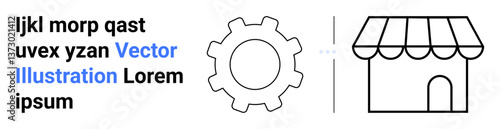 Gear symbol next to storefront outline, accompanied by placeholder text. Ideal for business, e-commerce, commerce, engineering, mechanics, teamwork, and simple landing page