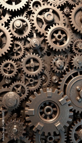 Gears and cogs wheels, vertical industrial background. Artwork digital illustration. From above technical texture of steampunk gears on metal dark background. Gears of the mechanism. Wallpaper design