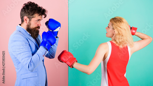 Gender equality. Man formal suit and athletic woman boxing fight. Couple in love competing in boxing. Female and male boxers fighting in gloves. Domination concept. Gender battle. Gender equal rights