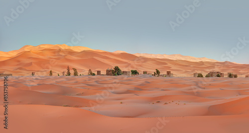General view of the Merzouga hotels district - Merzouga, Sahara, Morocco