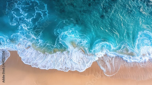 Generate an image of an aerial view where azure waves gently meet a soft sandy beach, highlighting a calm and scenic atmosphere