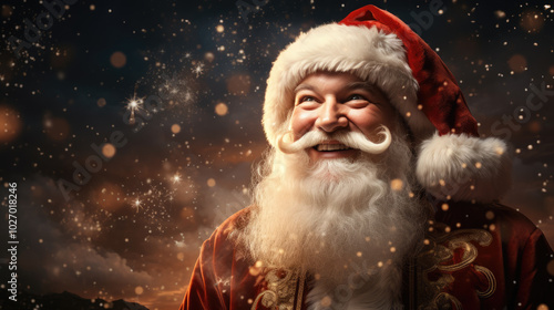 generated illustration of Santa Clause close up portrait with a snow falling background