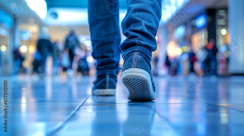 Generative AI. close up of man's foot walking on street, sneakers and jeans, background is busy shopping mall, depth of field,