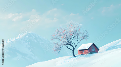Generative ai illustration of small house on snowy mountain near leafless tree against blue sky in winter day. Snowy Village. Illustration