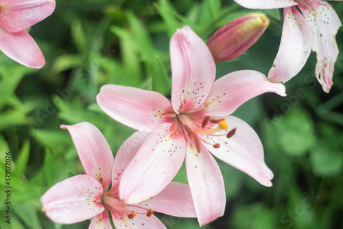 gentle, beautiful daylily white pink color. day-lily close-up. garden in the early morning Beautiful floral background with bokeh effect