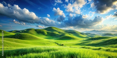Gentle hills rise from the earth amidst an endless expanse of lush green grasses swaying gently in the breeze under a bright blue sky with no clouds , natural beauty , serene scenery