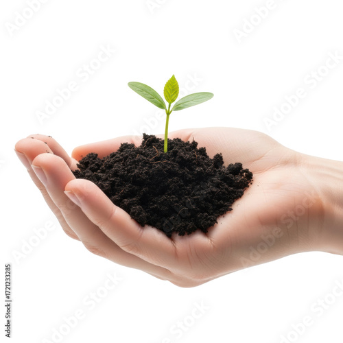 Gentle human hand, neutral skin, cradling fertile soil & tender green seedling with unfurled leaves on transparent background, macro shot. Concept of nurturing new life