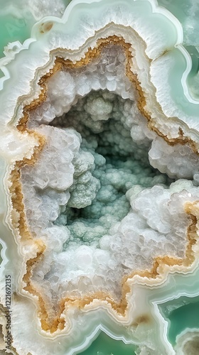 Geode Cross-Section with Light Green Crystal Clusters and Concentric Bands