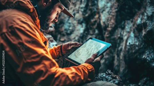 Geologist analyzing data on rugged terrain using a tablet for field research