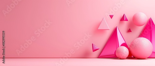 Geometric abstract background with pink shapes, including pyramids and spheres, on a soft pink backdrop. Futuristic and minimalist design.