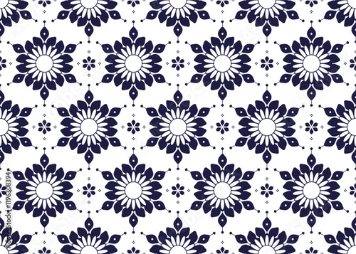 geometric and floral ethnic fabric seamless pattern, dark blue on White background, design for cloth, carpet, batik, wallpaper, wrapping etc.