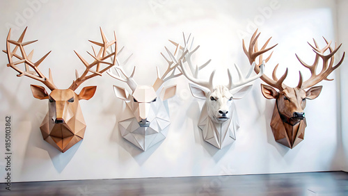 Geometric Deer Heads in Modern Minimalist Style with Soft White Lighting on Polygonal Texture for Interior Design