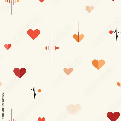geometric hearts and vertical pulse lines, red and peach palette, romantic minimal abstract design