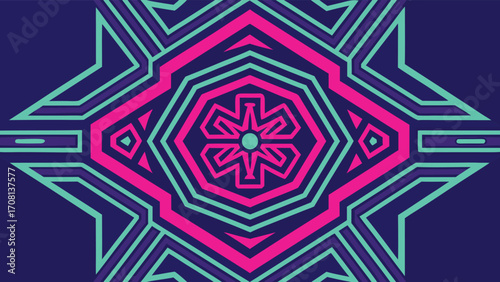 Geometric Octagonal Mandala Pattern with Pink and Teal Lines on Dark Purple abstract