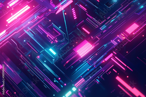 Geometric patterns with glowing lines in a cyberpunk-inspired digital space, creating a visually captivating and technologically advanced abstract composition