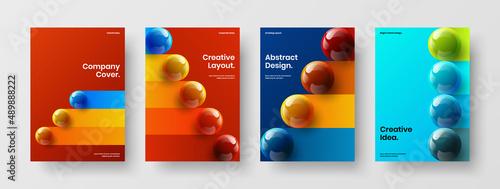 Geometric realistic balls corporate brochure layout composition. Unique journal cover design vector illustration set.