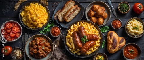 German Traditional Cuisine. Composition of Various German Foods. Bread & Rolls, Cheese spaetzle, currywurst, Potato Pancakes & Fried Potatoes, Roulades, Shnitzel, Stew, Braised Beef.