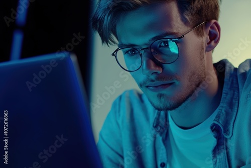 Geschäftsmann lächelnd Laptop Videokonferenz Nachtlicht Blaulicht reflektierende Brille Technologie moderner Arbeitsplatz Remote Arbeit digitale Kommunikation Homeoffice entspannte Atmosphäre Business