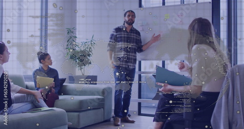 Gesturing presenter explaining project plan in meeting lounge, with whiteboard sticky notes