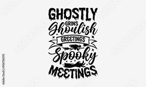 Ghostly Grins Ghoulish Greetings Spooky Meetings- Halloween t shirt design, spooky Quetes Halloween, Hand drawn lettering phrase, calligraphy vector illustration, Ai Cut file.