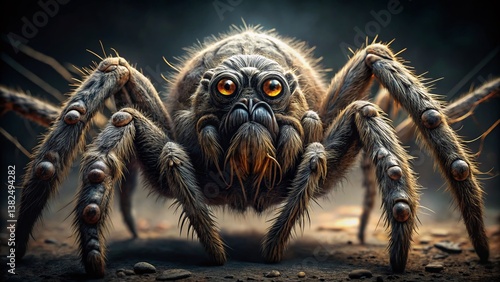 Giant Spider: A close-up, striking image of a large, hairy spider with intricate details, its many eyes staring intensely.