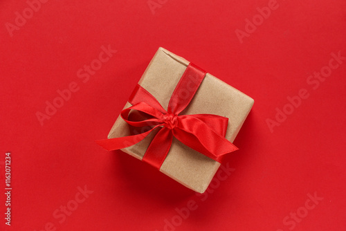 Gift box with ribbon on red background. Valentine's Day celebration