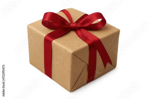 Gift box wrapped in brown craft paper with red ribbon bow, celebrating holidays, birthdays, and special occasions