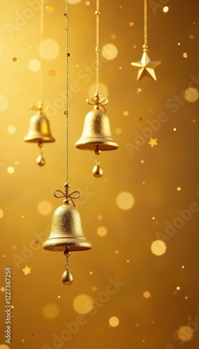 Gilded stars and bells suspended mid-air, isolated on a golden backdrop , shiny, design, gold christmas decorations
