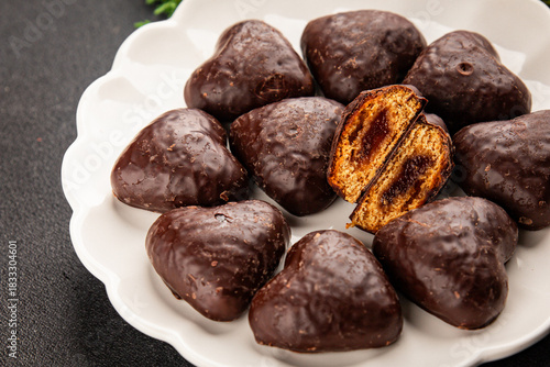 Gingerbread chocolate heart shaped honey cakes Christmas sweet dessert new year natural product tasty snack fresh delicious gourmet food background on the table rustic top view copy space