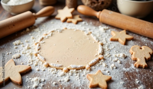 Gingerbread dough rolled out with cookie cutters, flour, and kitchen tools on a wooden surface