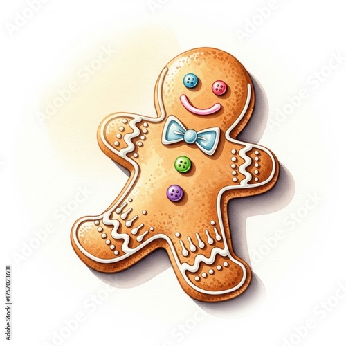 Gingerbread Man Cookie Illustration with Buttons and Bow Tie on White Background