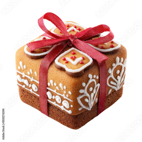 Gingerbread shaped like a gift box with cute decorative patterns isolated