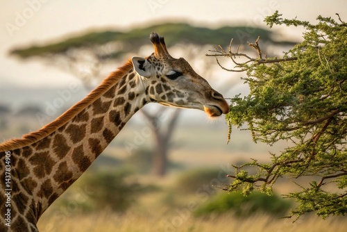Giraffe Standing Under Acacia Tree in African Savannah