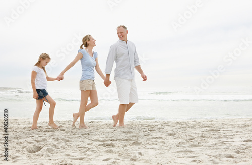 Girl (10-11) walking on beach with parents