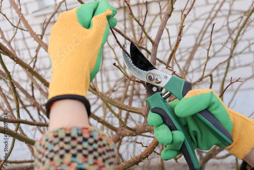 girl cuts off a bush rose with pruning shears. spring work in the garden. close up