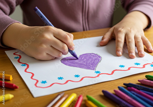 Girl Drawing a Purple Heart in Honor. Purple Heart Day Through a Child Eyes