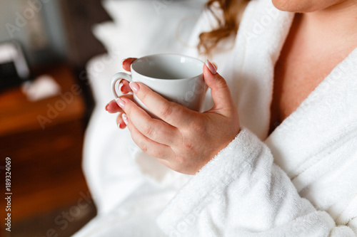 Girl in a white robe holding a white mug of coffee in his hands. Coffee in bed. The morning starts with coffee.