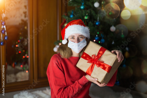 girl in red clothes and medical mask unfold New year gifts. the concept of celebrating Christmas midnight. Holiday's decor boce, Christmas tree