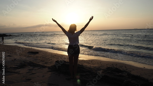 girl standing at the beach sunset thailand koh lanta